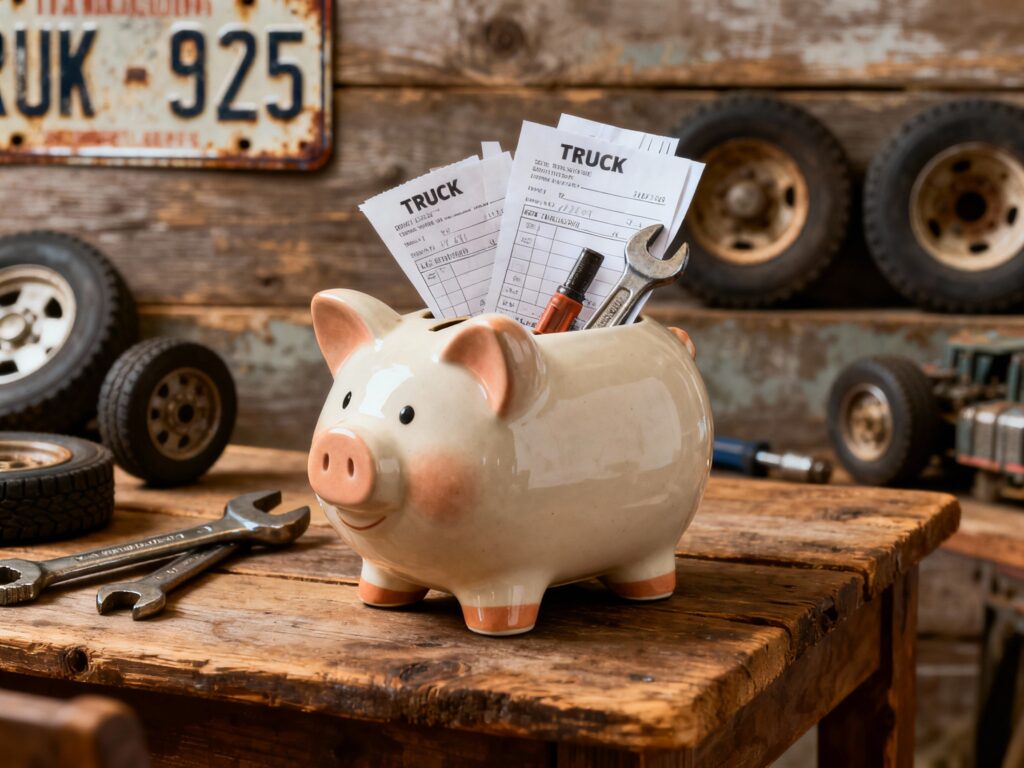 A visual representation of a piggy bank filled with truck-related expenses to illustrate financial management for first-time truck owners.